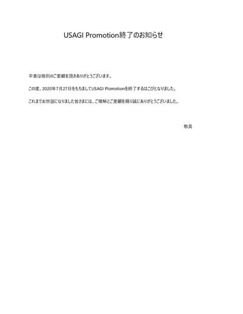 この度、2020年7月27日をもちましてUSAGI Plomotionを終了するはこびとなりました。